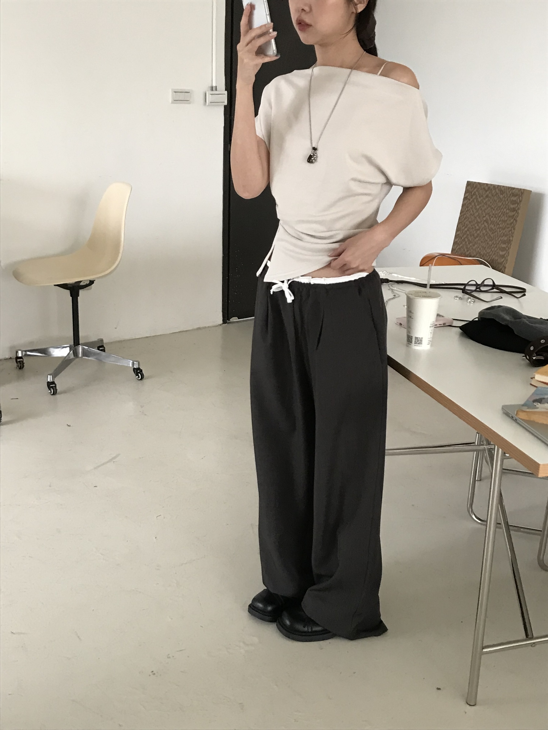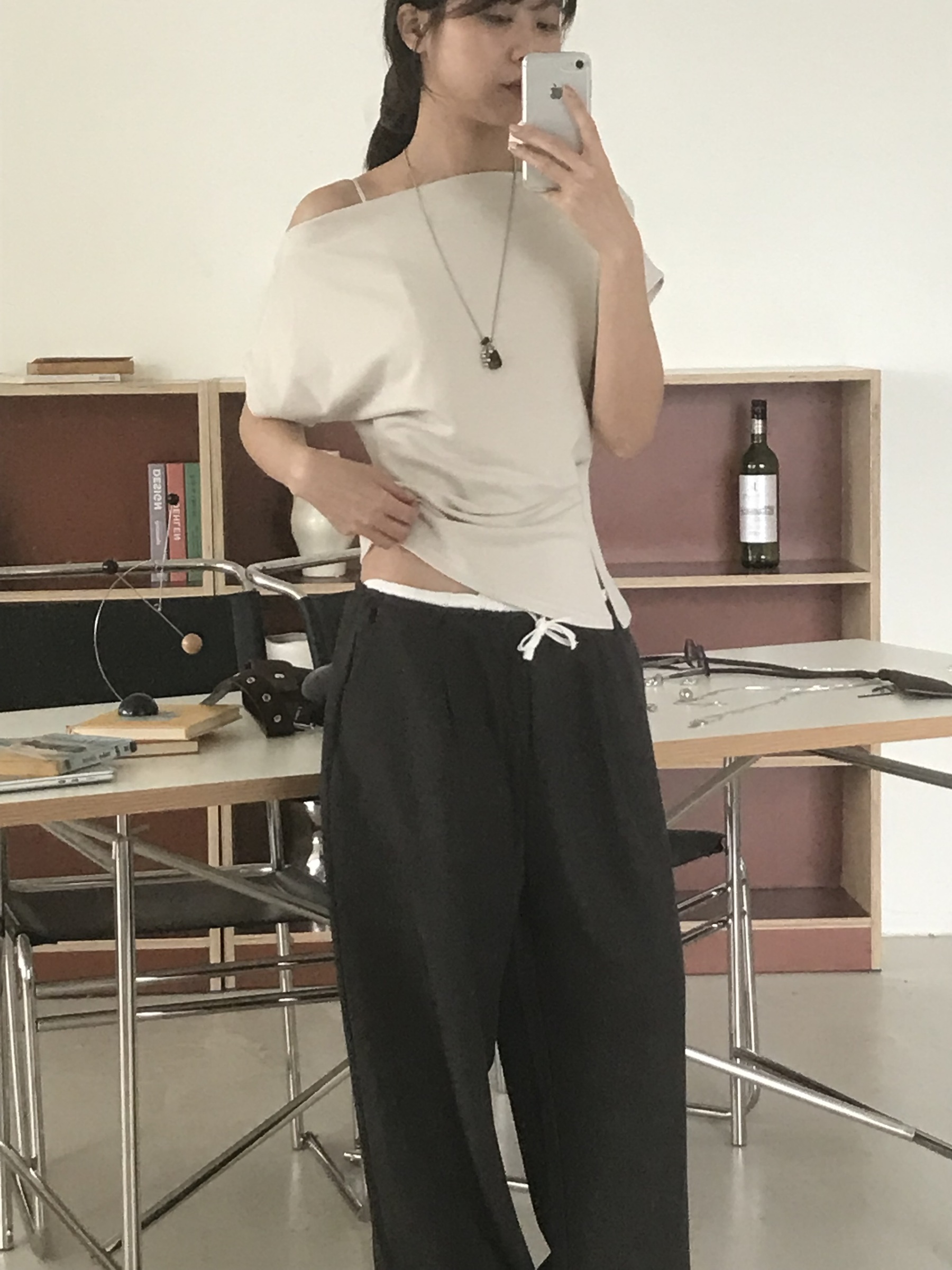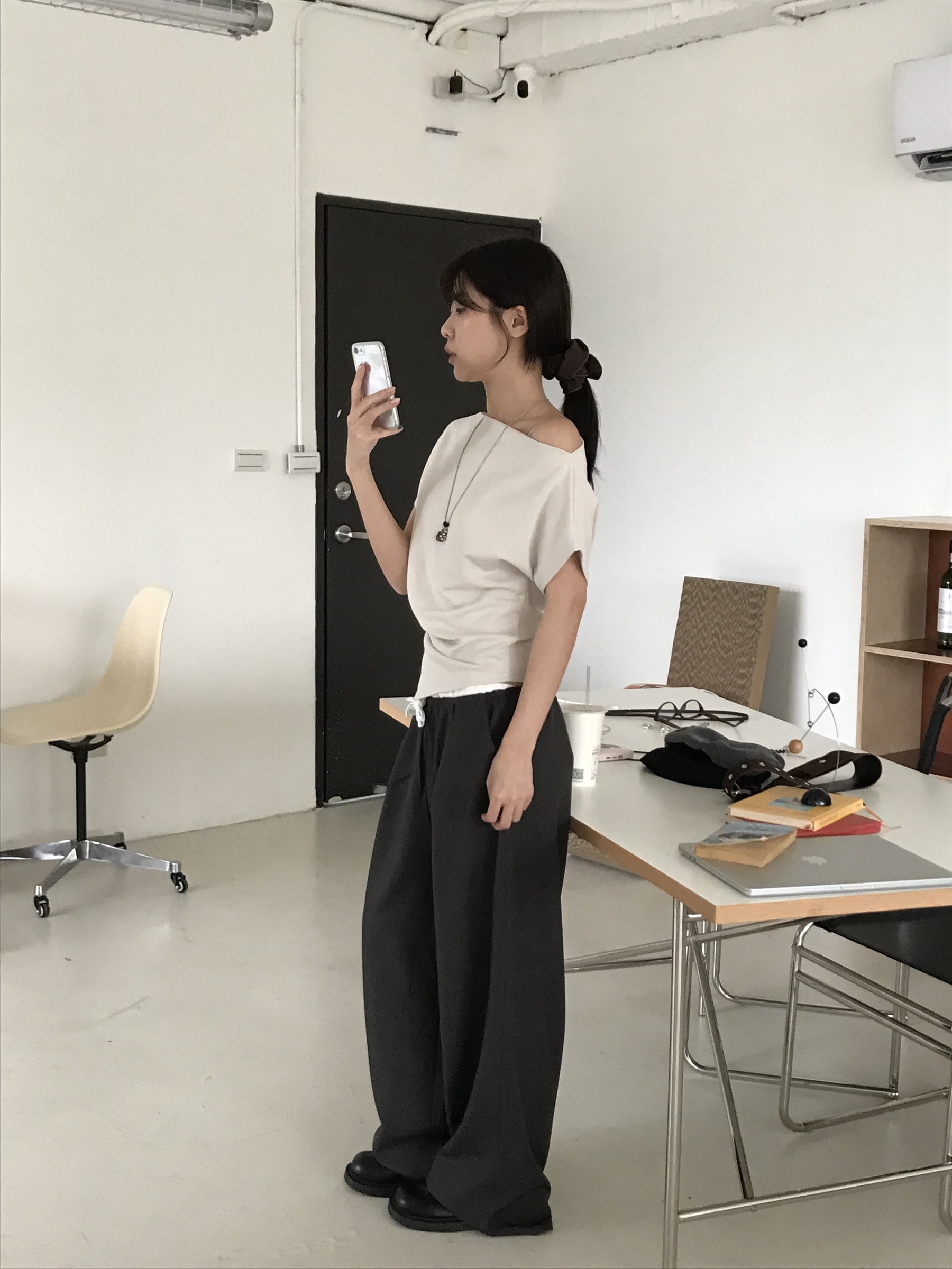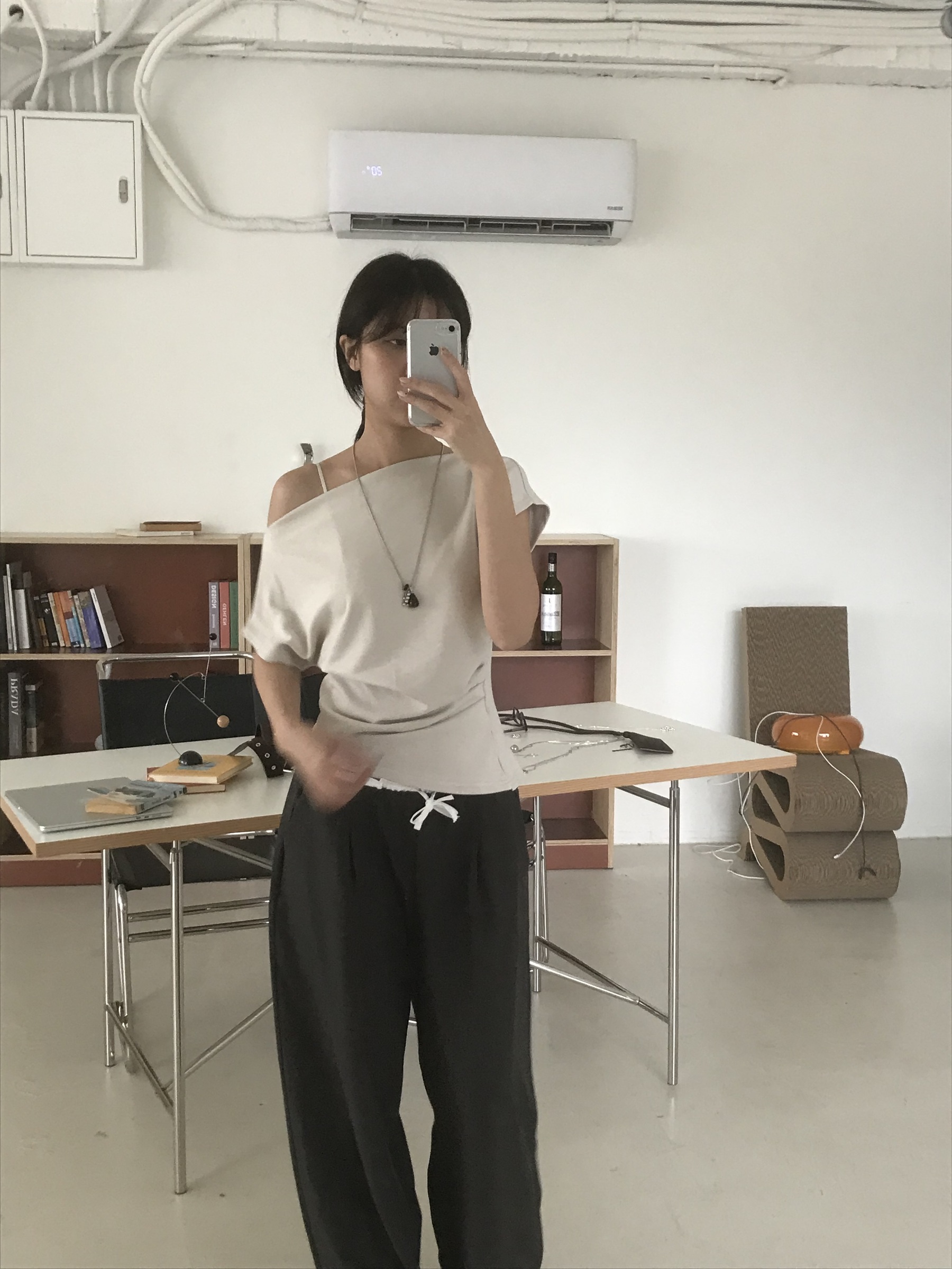 微磅斜領抓皺上衣 (米杏/深棕/黑)